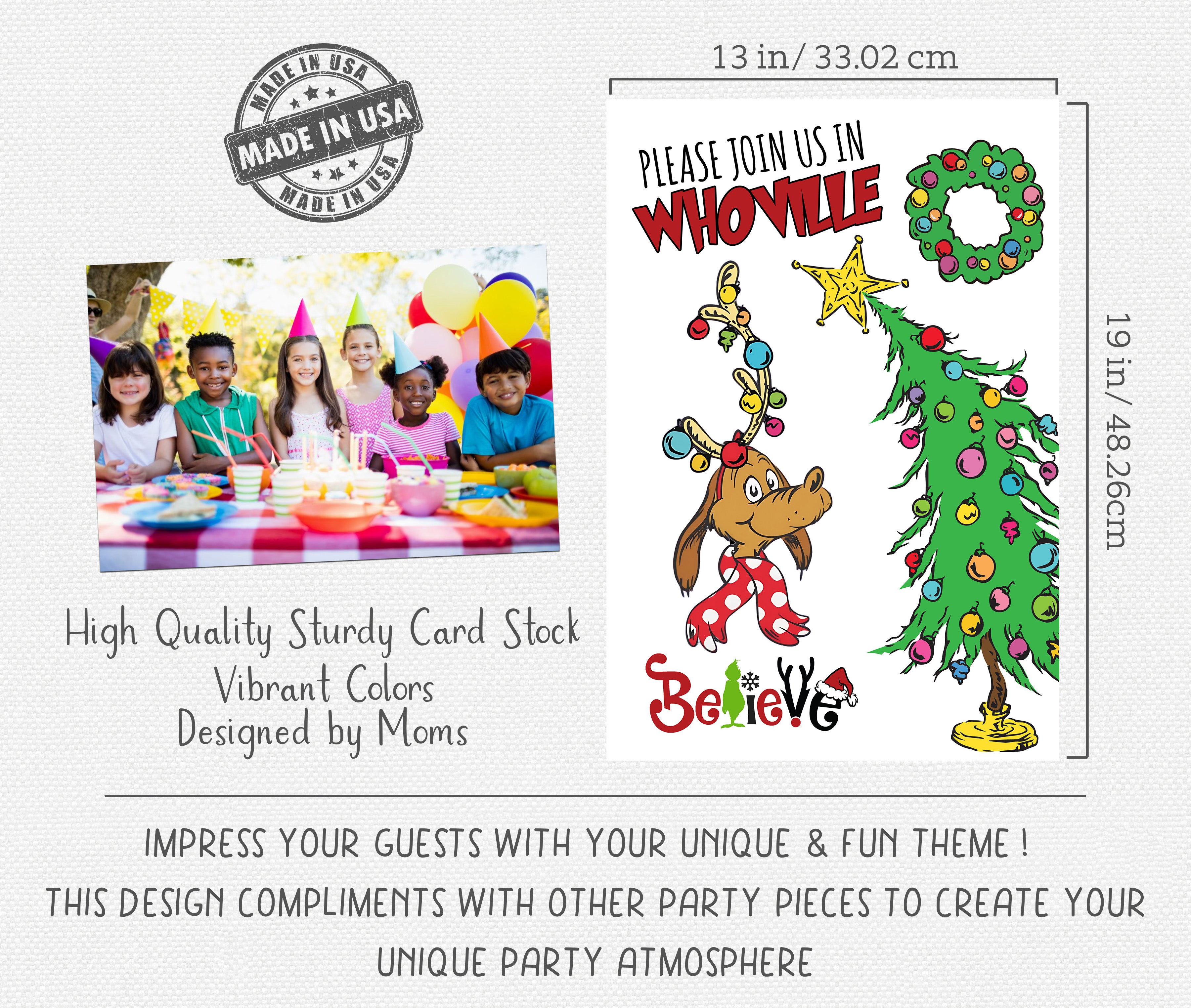 Celebrate this Holiday Season with this "Please Join Us In Whoville" party banner decoration! This charming 19x13 inch poster features whimsical holiday-themed designs that bring joy and magic to your celebration. This professionally printed banner adds a playful touch to any baby shower or party décor. Make your event unforgettable with this delightful Whoville-inspired decoration!