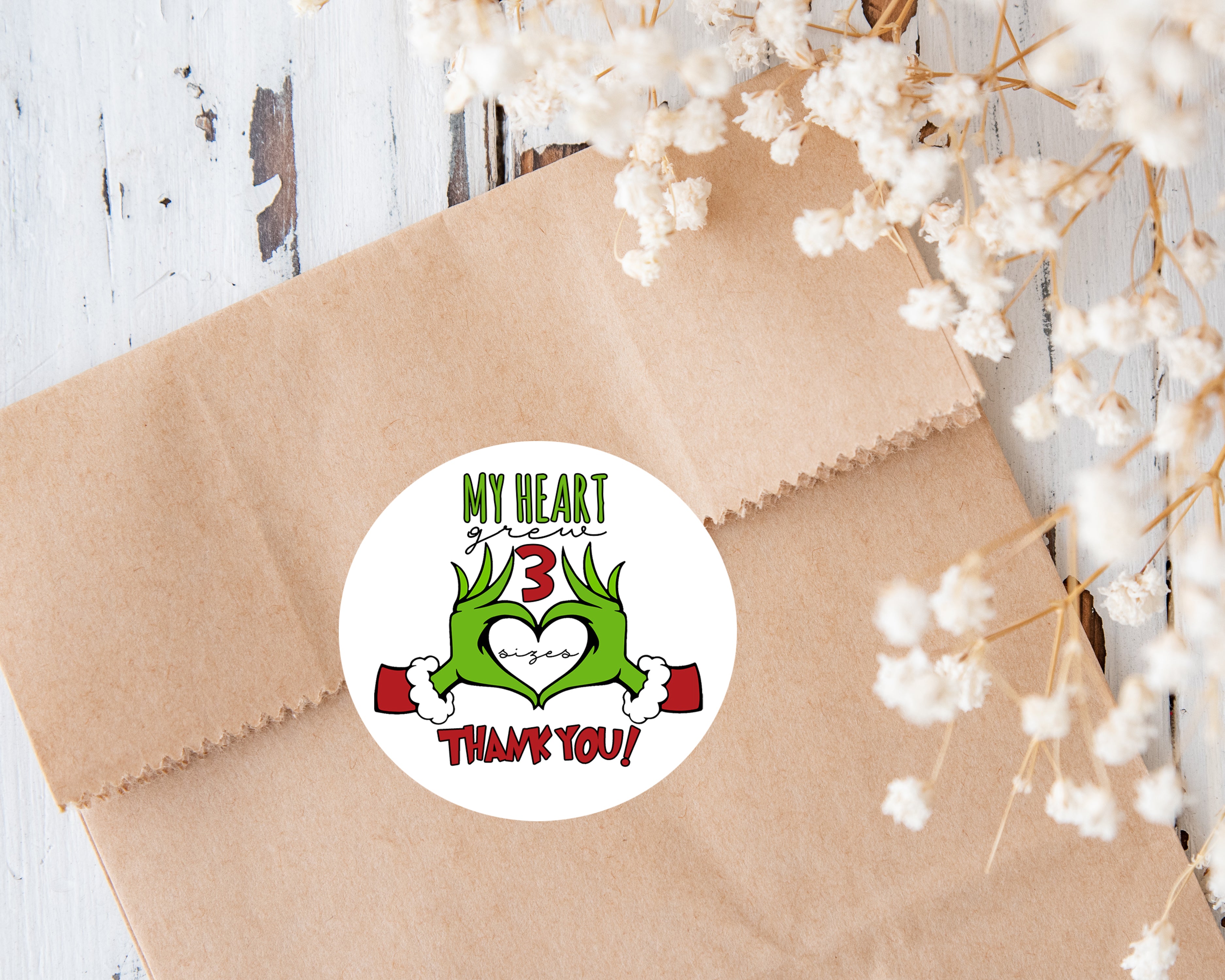 Celebrate this Holiday Season with these playful "My Heart Grew Three Sizes - Thank You" party favor stickers and gift labels! This set includes 24 charming movie themed circle labels, perfect for adding a magical touch to your holiday-themed celebration. Professionally printed and full of whimsical charm, these stickers help you express heartfelt thanks while delighting guests with their festive spirit. Ideal for any baby shower or party, perfect for neighbor or co worker gifts,, they make your favors unforgettable and fun.