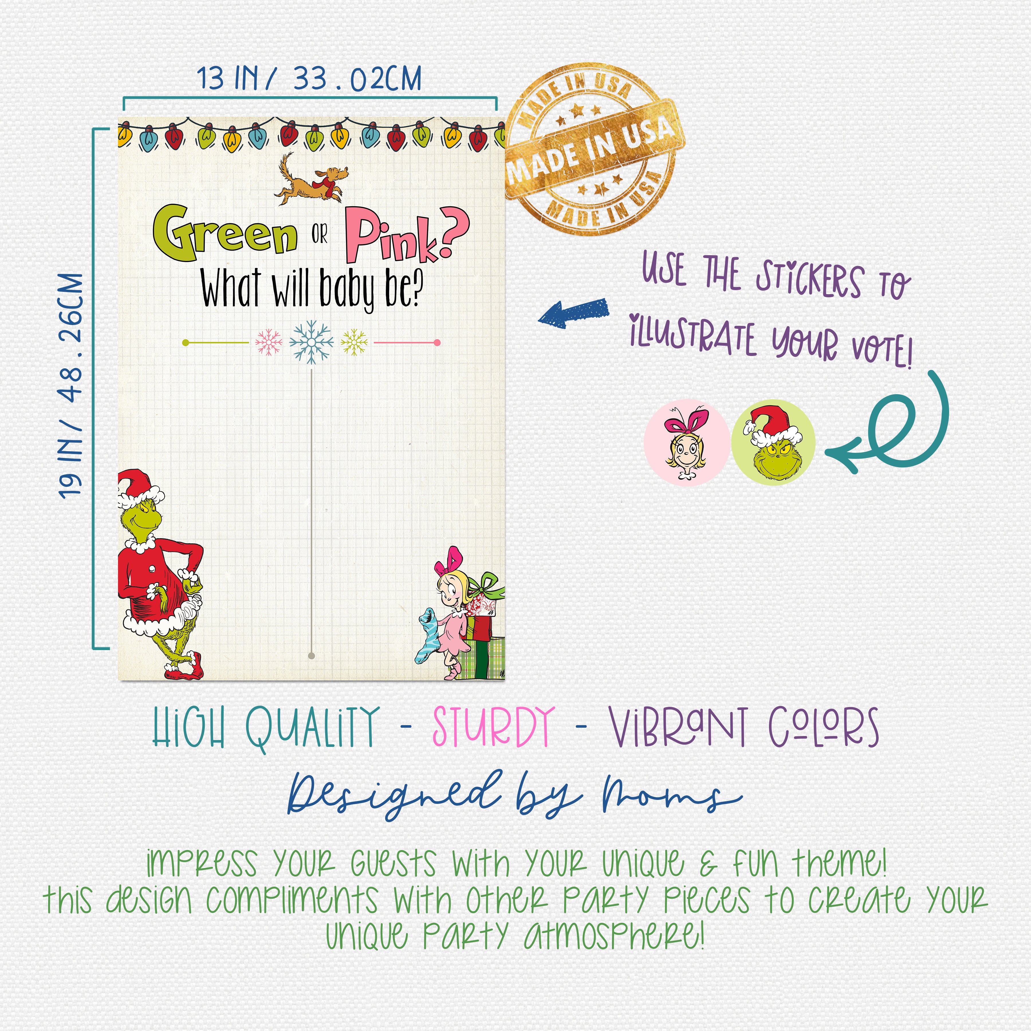 Get everyone excited for your gender reveal with this playful Pink or Green “What will our Little Who be?” party game! Perfect for casting votes, this set includes a vibrant poster and 30 fun stickers featuring unique, high-quality graphics. Made in the USA, it’s an adorable way to add festive cheer to your Little Who Christmas-themed baby shower. Don’t forget to check out our coordinating party pieces to complete your celebration!