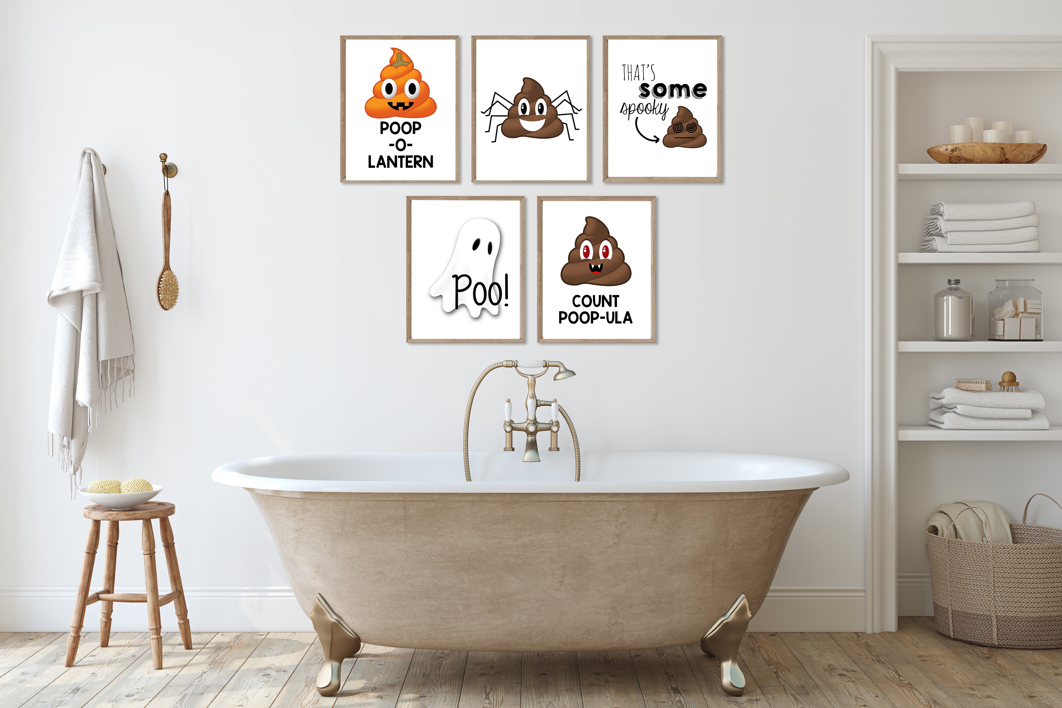Funny Halloween Poop Emoji Themed Bathroom Wall Art Print Decor (Set of 5) 8X10
